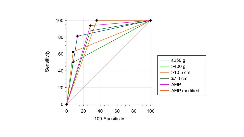 BACKGROUND: Pediatric adrenal cortical carcinoma (ACCp) is a malignant and extremely rare tumor, but with a higher incidence in Brazil than in other countries(1). The histological diagnosis of adrenal cortical tumors (ACT) still finds it difficult to define the malignant/benign clinical behavior of these tumors(2). The Wieneke criteria, also called Armed Forces Institute of Pathology (AFIP®), is the best one for the pediatric population comparing to Weiss scoring system used for adults(3). However AFIP did not reach 100% sensitivity for defining malignant clinical behavior in one of the largest patients series as recently published(4). The weight (> 400g) and size (>10.5cm) criteria used by AFIP to define the malignant/benign clinical behavior of ACT may be good for kids/adolescents, but may also be huge for toddlers, specially, infants. The aim is to adjust the weight and size threshold of the Wieneke criteria (AFIP) to improve its sensitivity.