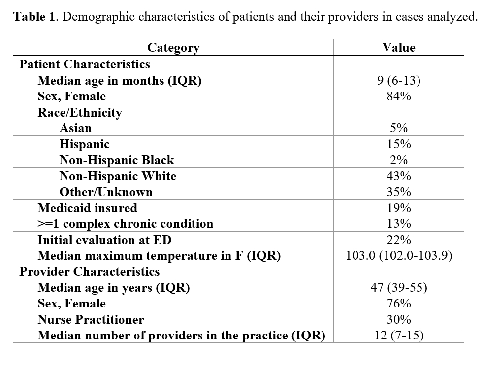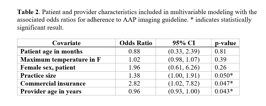 METHODS: All children <24 months old with fUTI (temperature ≥38C, positive urinalysis, and >50,000 CFU on urine culture) in a large primary care network in Mass. in 2019 were reviewed. Those with congenital genitourinary anomalies were excluded. After bivariate analyses of potential covariates of age, gender, race, insurance, maximum temperature, setting (ER vs. office), presence of complex chronic conditions, practice size, and provider type and age, we fitted a multivariable logistic regression model with a primary outcome of adherence to the AAP guideline.