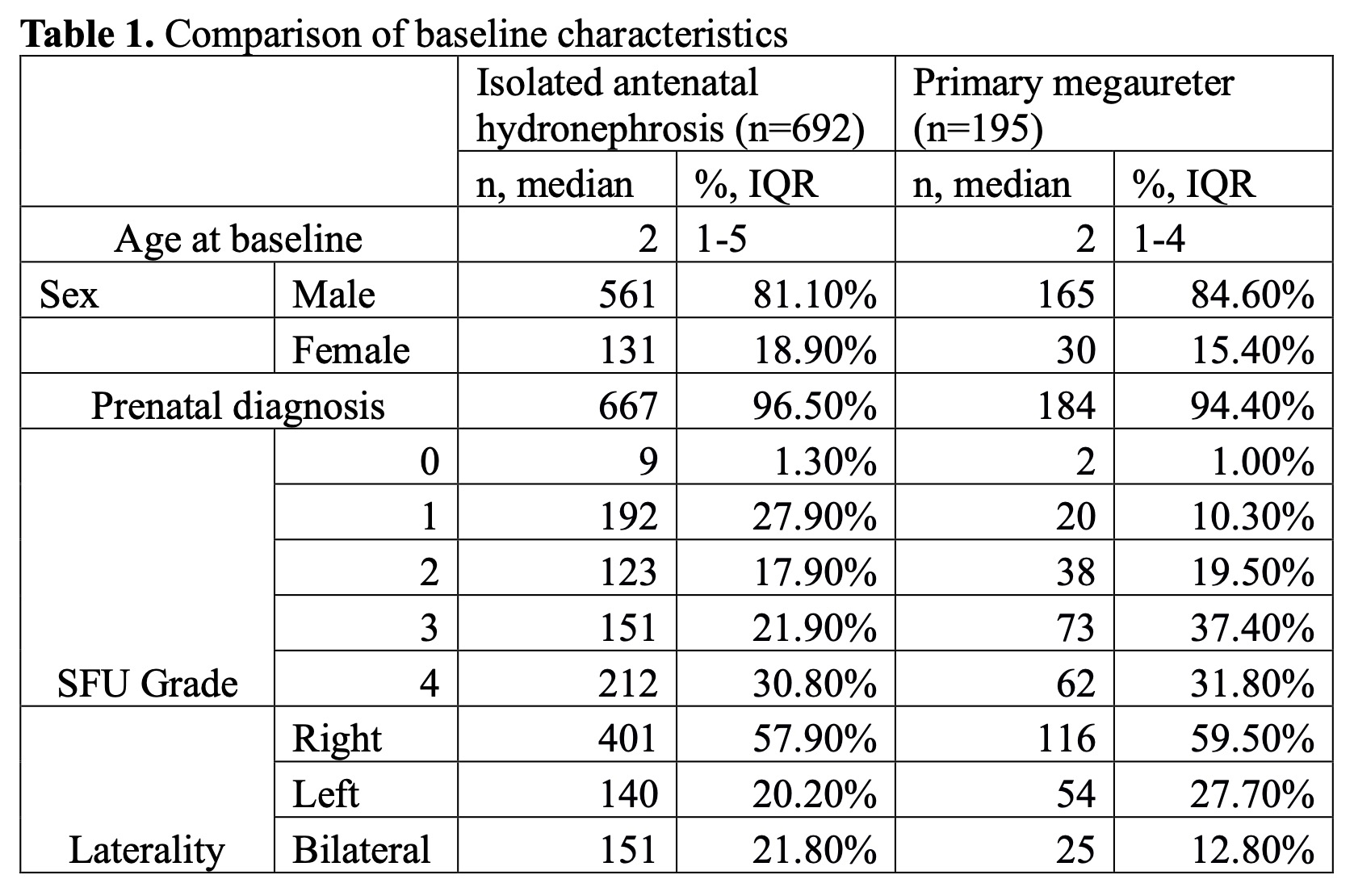 BACKGROUND: Primary non-refluxing megaureter (PM) is an entity that is separate from isolated hydronephrosis (HN). Literature has shown that patients with hydroureter are more likely to experience urinary tract infections (UTI) and have greater benefit from continuous antibiotic prophylaxis (CAP). While absolute risk reduction has been evaluated, there has been limited epidemiological assessment of time to UTI in a risk-adjusted manner. Herein, we combined the largest cohort of megaureter and isolated hydronephrosis reported in literature for a comparative analysis, using individualized patient data and time-varying exposure analysis.