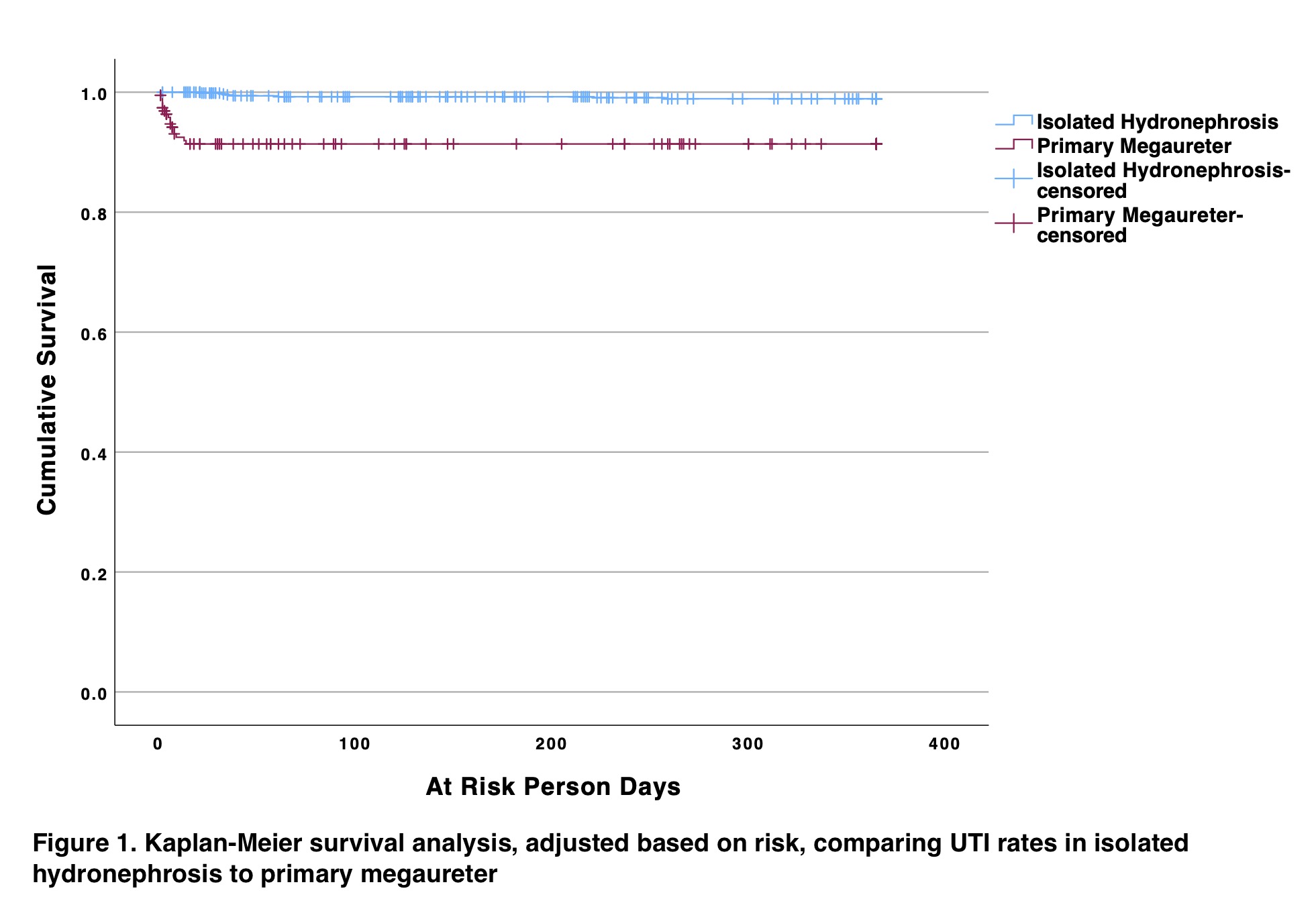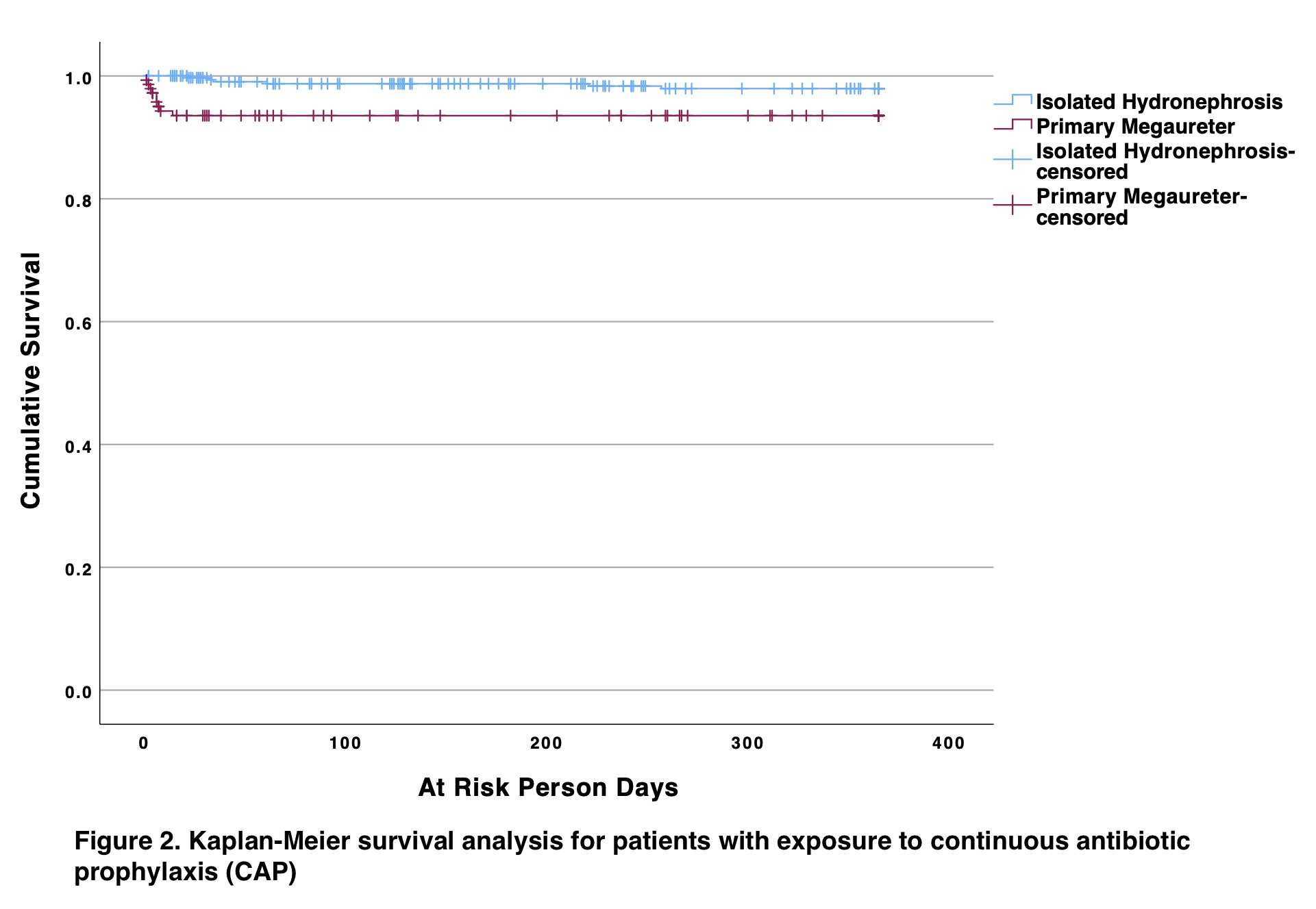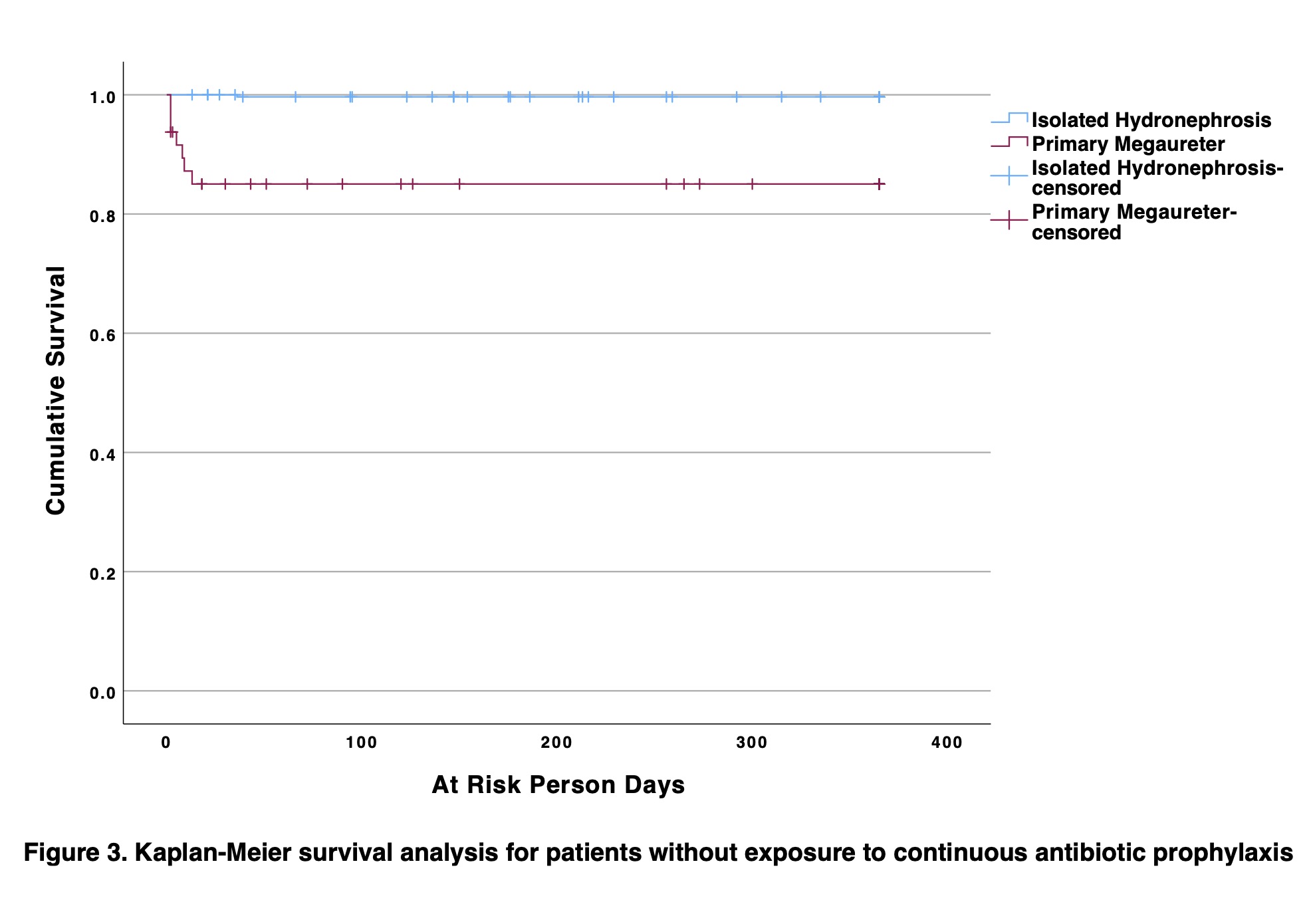 Methods: Our institutional PM database, as well as isolated HN database were examined. PM defined as hydroureteronephrosis with dilatation > 7mm. We excluded patients with other etiologies for upper tract dilatation. UTI was defined as fever >38.5°C, with positive urinalysis and culture from catheterized specimens. Only UTIs within the first year of life were included. To adjust for time-varying exposure, patients were censored based on CAP discontinuation, UTI event, surgery, loss to follow-up, or hydroureter resolution. A Kaplan-Meier time-to-event analysis was performed.