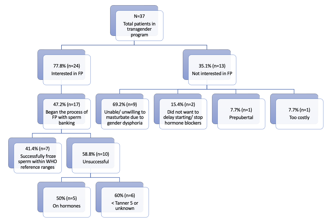 Conclusions: Fertility preservation (FP) is an important step prior to initiating gender affirming hormonal therapy or puberty blockade. Data suggest that with the integration of a pediatric urology team, a high percentage (78%) of patients may be interested in fertility preservation. Nearly half of patients began the process of FP with sperm banking, 41% of whom successfully froze sperm within WHO reference ranges of semen parameters. These rates are high compared to previous studies regarding interest in pursuing and completing fertility preservation in transgender females (47-62% and 8.6-17%, respectively). Our findings highlight the importance of the integration of pediatric urology and FP into the health care process prior to pubertal suppression therapy.