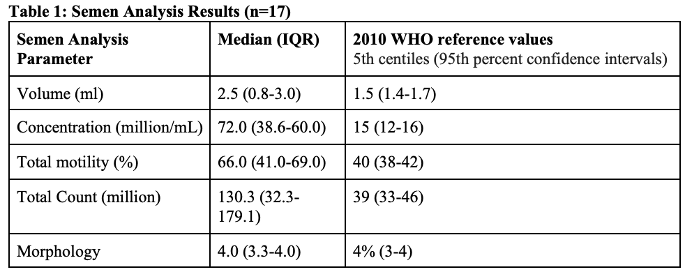 Results: 37 patients with a mean age of 15.1 +/- 1.9 years met inclusion criteria. As described in Figure 1, 77.8% (n=24) were interested in pursuing/are in the process of sperm banking. Of the patients who did not pursue FP (n=12), 69.2% (n=9) reported unwillingness or inability to masturbate due to gender dysphoria, 15.4% (n=2) did not want to delay starting or stop hormone blockers, 7.7% (n=1) were prepubertal (Tanner I), and 7.7% (n=1) cited sperm banking as too costly. 47.2% (n=17) of patients began the process of FP with sperm banking, seven (41.4%) of whom had successful cryopreservation within WHO reference ranges of semen parameters. Of the children who did not meet WHO criteria, half were on hormone medications (50%, n=5). One child had azoospermia; upon review, it was found that they already started hormonal suppression. Average results of semen analysis are presented in Table 1.