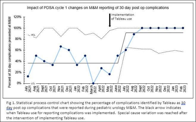 Methods: This was a single institution multiphase quality improvement project. We performed a current state analysis of pediatric urology M&M reporting and found that we were consistently not reporting all complications within the 30 day post operative period, particularly emergency room visits when patients were discharged. In PDSA (Plan Do Study Act) cycle 1, we used Tableau (Seattle) an automated analytic software linked to the electronic medical record to capture 30 day post-operative complications. Tableau was structured to report return to the operating room, return to the emergency department, and readmission within 30 days of surgery. Five month after instituting this intervention we studied our results and found that some complications and near misses were not reported. As a result, we implemented a PDSA cycle 2 which focused on improving reporting of complications and near misses by staff through a dedicated M&M email.