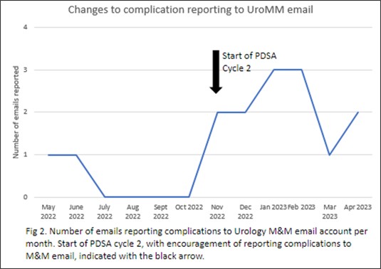 Results: Prior to the intervention, reporting of 30 day post operative complications ranged from 0-66%. After implementing PDSA cycles 1 and 2 over a period of 4 months the 30 day post operative complication reporting increased to 100% and was maintained at 100% for 6 months (Figure 1). During the study phase of PDSA cycle 1, we found that while reporting of 30 day post operative complications from Tableau improved, we were still missing some complications and near misses that did not meet the Tableau criteria. After encouraging reporting of complications to a dedicated M&M email, number of emails reporting complications improved from a median of 0 during PDSA cycle 1 to a median of 2 during PDSA cycle 2 (Figure 2). CONCLUSIONS: