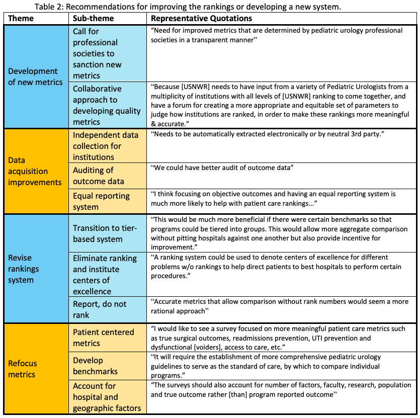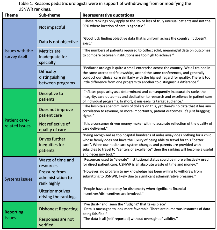 Methods - An anonymous, web-based survey about the USNWR pediatric urology rankings was emailed to candidate and active members of the Societies for Pediatric Urology. The survey was developed iteratively by the study team, and contained both quantitative and qualitative elements. This study focuses on the qualitative survey responses; full quantitative results will be reported separately. Free-text responses about 1) opinion on withdrawing from the rankings, 2) development of a survey that adequately distinguishes between programs and 3) any additional thoughts on the topic were solicited. Thematic qualitative analysis of free-text responses was performed by two coders using an inductive and deductive approach. Codes were compiled and summarized into themes and subthemes, with representative quotations.
