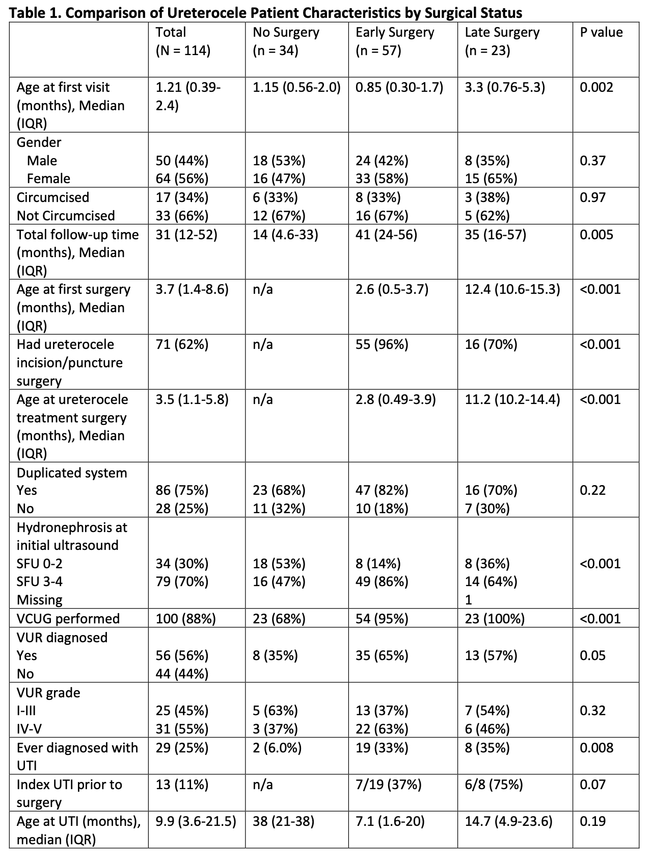 Methods: We examined patients in the SPU Hydronephrosis Taskforce, which has prospectively enrolled pediatric patients with prenatal hydronephrosis from 7 centers between 2007-2023. We identified patients with ureteroceles, and excluded those with concomitant neurogenic bladder, urethral, and/or genital anomalies. We collected demographic and clinical data including age, gender, circumcision status, ureterocele laterality, duplication, voiding cystourethrogram (VCUG), vesicoureteral reflux (VUR), hydronephrosis, urinary tract infections (UTI) and surgeries performed. We categorized hydronephrosis and VUR using the Society of Fetal Urology (SFU) and International grading systems, respectively. We classified surgeries as early (before 6 months of age) and late (after 6 months of age), and we performed comparative analyses of patients who had early, late, or no surgery. Chi-square or Wilcoxon tests with p-value < 0.05 were considered significant.