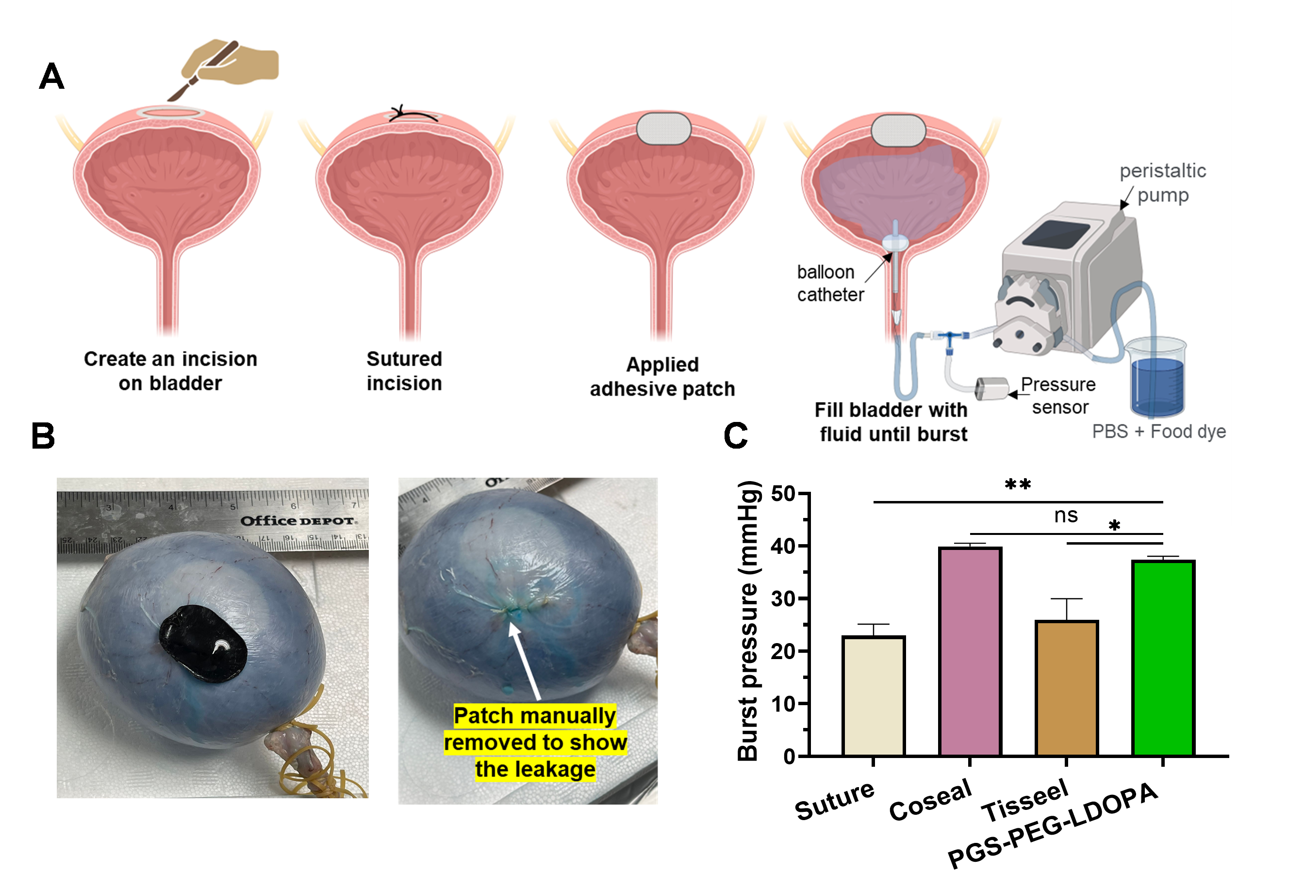 1Terasaki Institute for Biomedical Innovation, Woodland Hills, CA, USA, 2University of California, Los Angeles, Los Angeles, CA, USA. Bioabsorbable and Elastic Bioadhesive Patch for Suture Line Reinforcement in the Lower Urinary TractBackground: Lower urinary tract reconstructive procedures including urethroplasty in proximal hypospadias oraugmentation cystoplasty in neurogenic bladder have high learning curves and 30-day postoperative complicationrates. Surgical technical factors contribute to these complications which include urine leak, fistula, dehiscence, andinfections. To address these needs, we synthesized and evaluated the efficacy of a novel bioabsorbable andbioadhesive patch comprising poly(glycerol sebacate)-co-poly(ethylene glycol)-l-3,4-dihydroxyphenylalanine(PGS-PEG-L-DOPA) for reinforcing internal suture lines. The resultant adhesive patches are specifically designedfor application to dynamic and fluid-filled organs that undergo repetitive physiological motion to reducepostoperative complications, readmissions, and time to restore lower urinary tract function following lower urinarytract reconstruction.Methods: PGS-PEG-L-DOPA prepolymers were synthesized by a melting polycondensation reaction using varyingmolar ratios of glycerol:sebacate:L-DOPA to optimize the stretchability and elastic modulus of the adhesive patchescomparable with the bladder tissue. The prepolymers were added to Teflon molds and crosslinked in a vacuum oven(30 mmHg, 160°C) to form solid adhesive patches. Data are presented as a mean of n=5 ± SEM. Between-groupdifferences were analyzed using one-wayANOVA; presented as ∗ (p< 0.05), ∗∗ (p< 0.01), ns (non-significant).Results: Fig 1A displays a photo of thePGS-PEG-LDOPA patch undergoingtensile testing. The patches containingGlycerol:Sebacate molar ratio of 2:1 andL-DOPA 0.24 mg demonstrated 231.6 %± 11% elongation (1B). Additionally, theresultanttensilemoduluswascomparable to that of the bladder tissue(1C). The patches reduced 45.8% ± 5%of their mass within 5 weeks incubation
