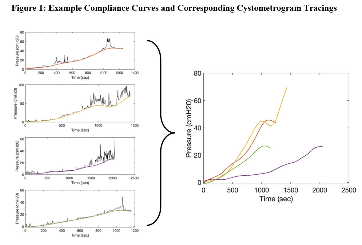 METHODS: UDS at a single instruction from 2013 to 2019 were used for algorithm development and validation. The electronic medical record was used to identify renal ultrasound (US) studies and clinical covariates including demographics, presence and grade of vesicoureteral reflux (VUR), continence, and bladder management in patients undergoing UDS. We defined the “compliance curve” by utilizing a proprietary algorithm to systematically create a noise-free curve from intravesical pressure (Figure 1). Additional measurements extracted from the compliance curve included curve tortuosity, arc length, algorithm-derived detrusor maximal pressure (PdetMax) and detrusor leak point pressure (DLPP), segmented area under the compliance curve (AUCC), and mean compliance curve pressure versus % volume.