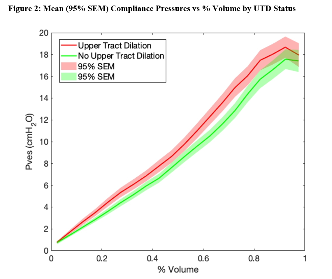 Results: 1178 UDS (864 unique patients) were included. The mean age was 10.4±7.2 years and 54% were female. UTD was found in 560 UDS. Compared to those without UTD, mean compliance pressures were significantly higher for patients with UTD (p<0.05, Figure 2).