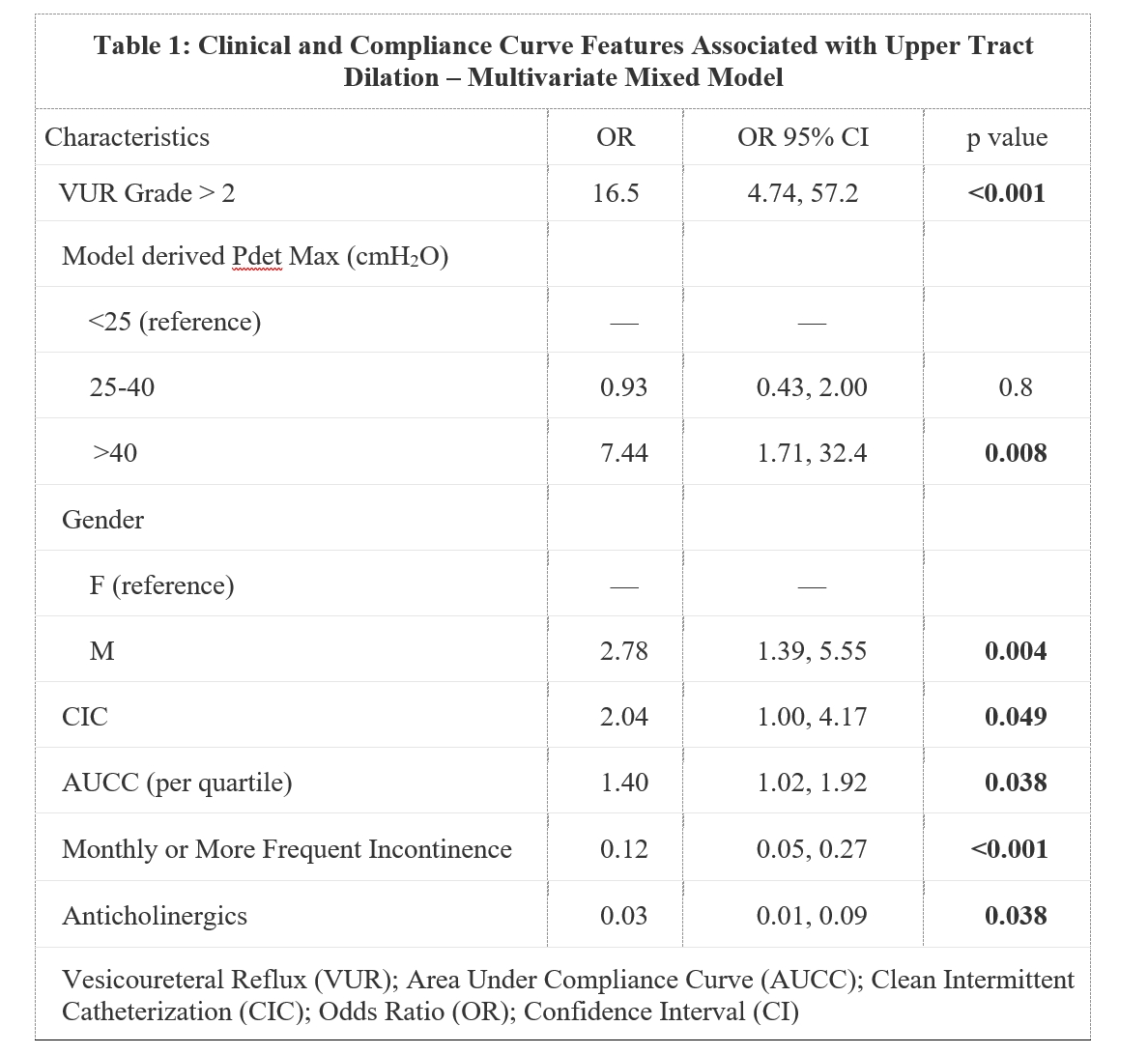 A multivariate mixed logistic regression model adjusted for repeated patients was fitted to assess the association between UTD and clinical or urodynamic covariates. Sensitivity analyses excluding either vesicoureteral reflux (VUR) grade >2 or non-neurogenic bladder were performed.