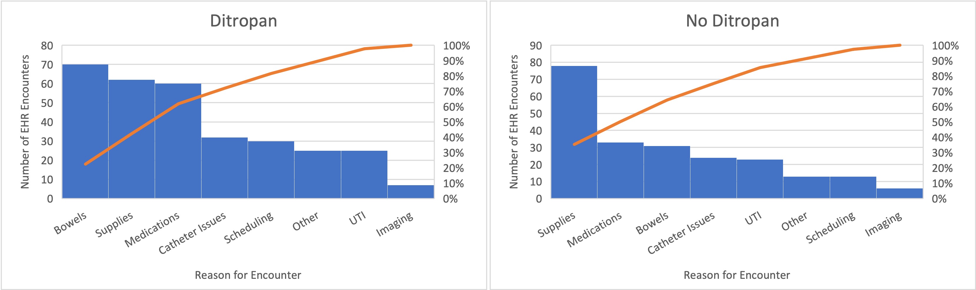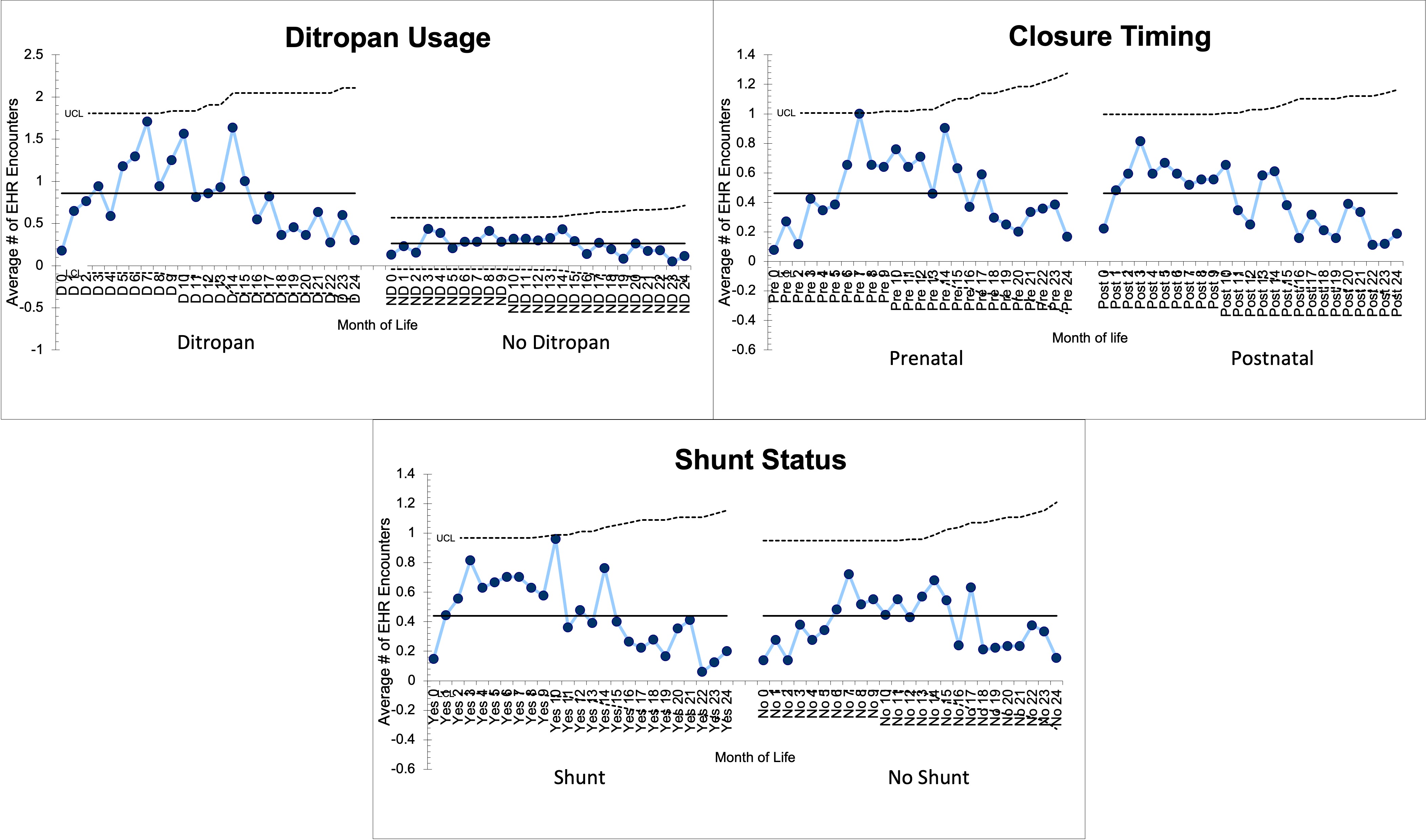 Introduction: Patients with spina bifida have complex medical needs that require management by multiple specialties. There is significant urologic involvement especially at a younger age when families may be getting used to caring for their child. Many concerns and questions that arise are addressed outside of regular scheduled clinic appointments. The aim of this study was to quantify and characterize these communications within the first 2 years of life in order to identify patient factors associated with increased care needs outside of scheduled visits. Methods: As part of an ongoing quality improvement project, all patients that presented to the multidisciplinary spina bifida clinic that were born after 3/1/2020 were identified. Baseline demographic information was collected. A review of the EHR was performed and identified all encounters made with the urology office separate from any scheduled clinic appointments. Information regarding type of communication, patient age at time of encounter and reason for encounter was collected for each encounter. X-bar/S charts were created with rational subgrouping to identify differences between patient populations when looking at encounters occurring during each month of life. Results: There were a total of 56 patients seen in our spina bifida clinic that fit inclusion criteria. Seventeen patients were started on anticholinergic therapy during the first 2 years of life. A total of 532 encounters were created within the EHR outside of scheduled clinic visits for all patients. Patients on anticholinergics represented 311 encounters and those not on anticholinergics were responsible for 221 encounters. The reasons for encounters were different when stratified according to anticholinergic usage (p=0.003, Figure 2), but no difference when stratified by shunt status (p=0.4) or closure timing (p=0.6). When subgrouping according to anticholinergic status there was a stark difference in encounters for each month of life, but these differences were not seen according to shunt status or closure timing (Figure 1).