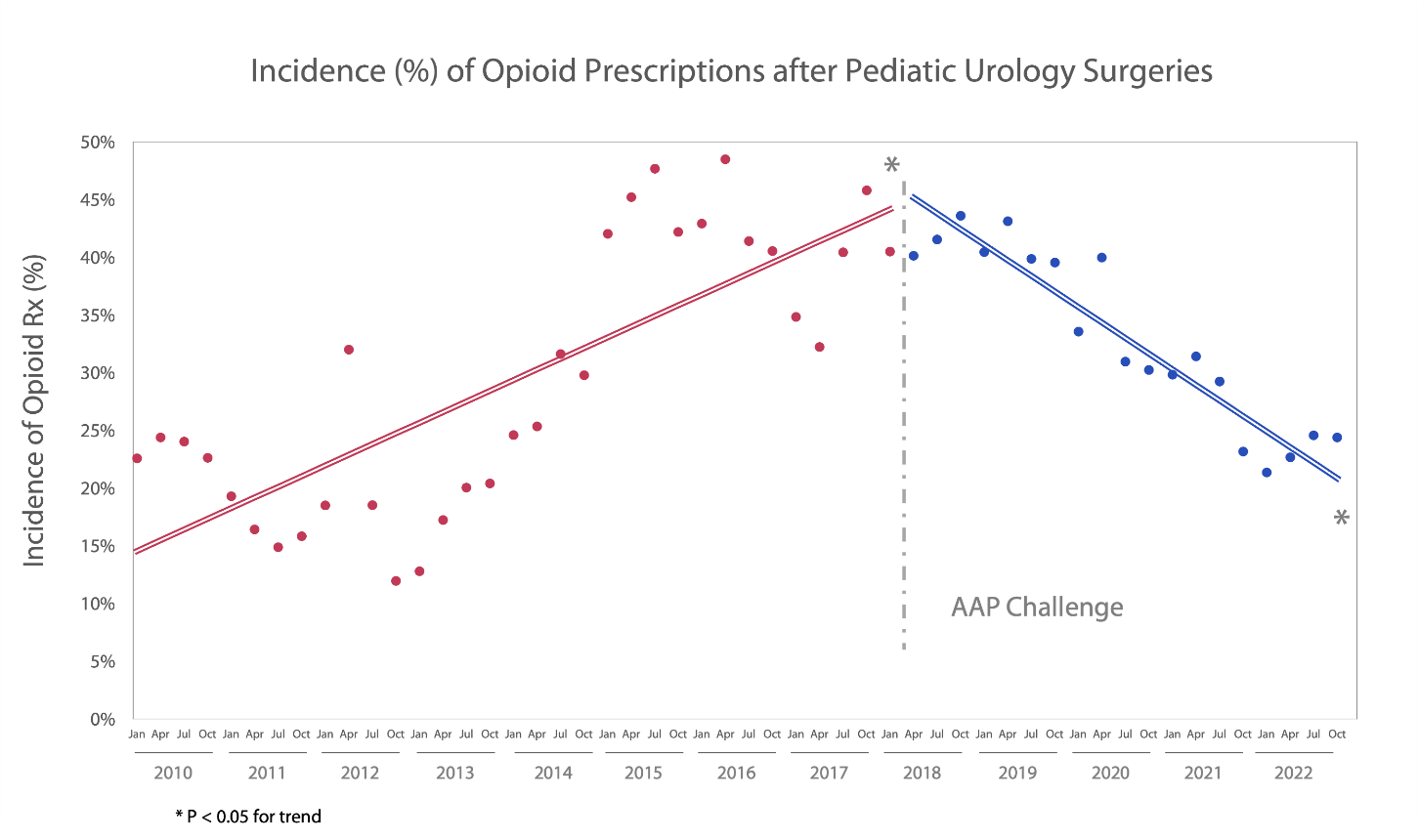 METHODS: We queried the TriNetX Research database and included children under age 18 who underwent circumcision, hydrocelectomy, inguinal hernia repair, orchiopexy, hypospadias repair, pyeloplasty, or ureteral reimplantation who received an oral opioid prescription within five days of surgery. Patients were excluded if they received any concomitant surgery. The primary analysis evaluated the total rate of opioid prescriptions (number of patients prescribed opioids/number of procedures) using 3 month intervals from January 2010 to December 2022. Secondary analysis was performed by procedures, race (White, Black, Hispanic), age (0 to 5, 6 to 10, 11 to 18), and United States geographic region (West, Midwest, South, Northeast). We performed an interrupted time series analysis assessing trends prior to the challenge, immediate difference, and trends after the challenge. Linear regression for the interrupted time series was performed with statistical significance set at p<0.05. RESULTS: A total of 77823 pediatric cases were identified, 25617 (32.92%) of which received an opioid prescription. Table 1 displays the rate of pediatric urology opioid prescriptions over time. We found that opioids were on average prescribed at a rate of 29.8% of circumcisions, 39.6% of hypospadias repairs, 25.8% of hydrocelectomies, 42.7% of pyeloplasties, and 42.8% of ureteral reimplants. An opioid prescription was received by 30.6% of patients ages 0 to 5, 34.3% of patients age 6 to 10, and 33.7% of patients ages 11 to 18. An opioid prescription was received by 36.7% of White patients, 28.7% of Black or African American patients, and 36.4% of Hispanic or Latino patients. An opioid prescription was received by 39.4% of patients in the West, 56.9% in the Midwest, 38.7% in the South, and 24.4% in the Northeast. In all cases, there was a significantly positive trend prior to the challenge and a significantly negative trend after.