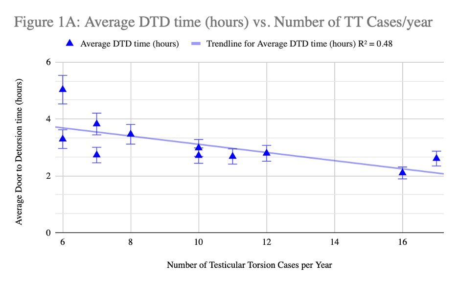Conclusion: The DTD time at our institution was inversely correlated with the volume of torsion cases per year, the chronological progression of our institution over 11 years, and across the 12-month resident training and education timeline each year. Our findings suggests that repeated exposure and experience with testicular torsion, both on a resident/medical professional and institutional level, is correlated with shorter DTD times. Further research must be performed to establish a benchmark for a high volume of cases at a center, and to explore alternative training/education avenues for residents at centers with a lower volume of cases.
