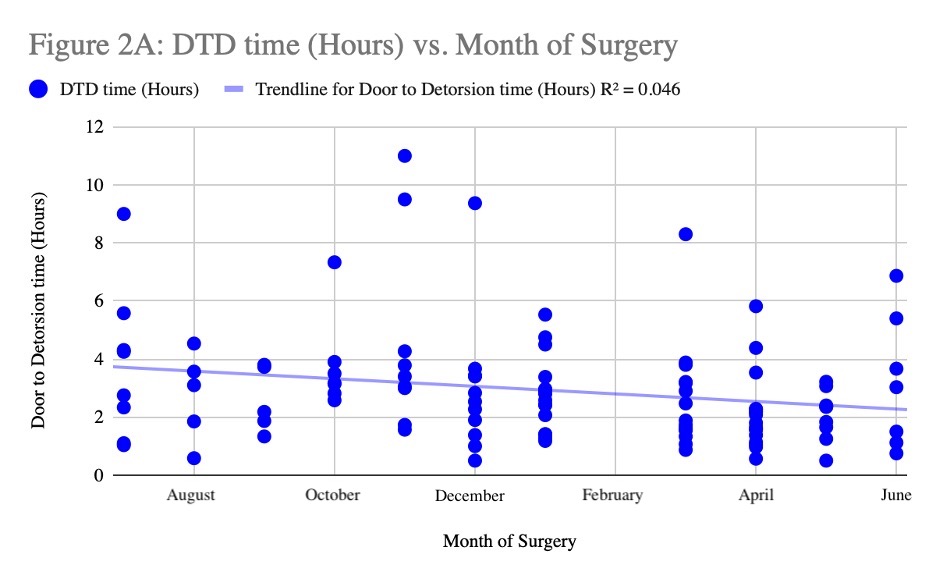 Figure 2A. Composite data from 2009-2019, ordered according to the academic year, ranging from July to June. The data demonstrates that resident training correlates with a lower DTD time (r = -.21, p=.028).