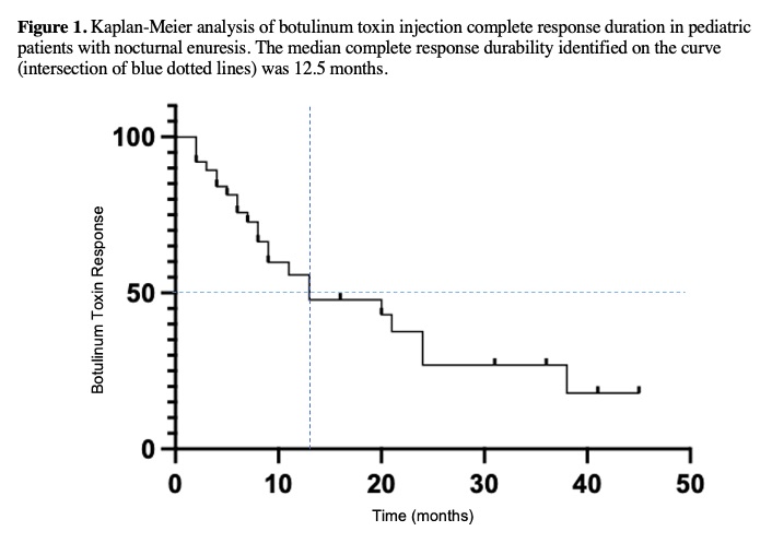 BACKGROUND: The pathophysiology of nocturnal enuresis (NE) is debated within the literature but is thought to be distinct from other voiding disorders. We hypothesize that detrusor overactivity is an underlying driver of this condition. Intravesical OnabotulinumA toxin (Botox) injections are widely utilized for management of symptomatic detrusor overactivity. We sought to assess the efficacy of Botox for management of pediatric patients with NE refractory to multiple lines of therapy. METHODS: We performed a retrospective cohort analysis of pediatric patients who were evaluated at a single tertiary institution for monosymptomatic NE. All patients had nightly incontinence episodes despite previously trialing at least one lifestyle modification (example: alarms), a three-month structured bowel regimen, and at least two medications from different pharmacologic classes (example: Oxybutynin and Desmopressin). Patients with neurogenic diagnoses or any genitourinary abnormality identified on imaging were excluded. The operative procedure was performed per a standardized protocol. Demographic, medical history, and peri-operative data were reviewed. The primary outcome was treatment success, which was defined as complete resolution in incontinent episodes (dryness) or significant improvement in total accident number but without complete resolution. Treatment failure was defined as no improvement in total accident number. We performed descriptive and bivariate statistical analyses as indicated. A Kaplan Meier (KM) analysis was performed to assess failure-free survival. RESULTS: Fifty patients met criteria and were included. The median age was 11 (5-15) years-old, 44% were female gender, and the median operative time was 9 (4-20) minutes. One-hundred units of Botox were administered to 82% and the additional 18% received 200. No intra-operative complications were reported. The median post-procedure follow-up time was 9.5 (2-82) months. Treatment success was observed in 94%, with 58% achieving complete resolution through most recent follow up. There was no difference in improvement (93% vs 100%, p>0.05) or resolution (61% vs 44%, p>0.05) for patients administered 100 vs 200 units. There was also no difference in improvement (93% vs 96%, p>0.05) or resolution (57% vs 59%, p>0.05) in male vs female gender. The median failure free survival identified on KM analysis was 12.5 months (Figure 1). Patients who achieved complete resolution of incontinence following Botox injections were less likely to carry a co-diagnosis of recurrent urinary tract infections (19.4% vs 55.6%, p=0.032), but no association was seen for co-diagnoses of vesicoureteral reflux or encopresis (p>0.05). Five post-operative complications were reported. Four developed a urinary tract infection and one developed retention necessitating a single catheterization.CONCLUSIONS: Intravesical Botox injections were effective for treating NE in 94% of patients with a median failure free survival of 12.5 months. Botox injections were additionally minimally invasive with short operative times and few minor complications in preliminary analyses. Future controlled studies are necessary to further assess this treatment option for refractory NE.