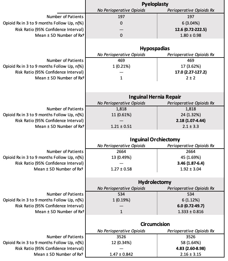Results: Overall, we identified 32,789 adolescents of which 66.0% received a perioperative opioid prescription. After propensity score matching, 18, 416 patients were included: 197 for pyeloplasty, 469 for hypospadias repair, 1,818 for inguinal hernia repair, 2,664 for inguinal orchiectomy, 534 for hydrocelectomy, and 3,526 for circumcision. Overall, 0.41% of patients who did not receive perioperative opioids developed new persistent opioid use, whereas 1.69% of patients who received perioperative opioids developed new persistent opioid use (p<0.05). Patients who received perioperative opioids had statistically higher odds of developing new persistent opioid use after hypospadias repair (Risk Ratio (RR): 17.0; 95% Confidence Interval (CI): 2.27-127.2), inguinal orchiectomy (RR: 3.46; 95% CI: 1.87-6.4), inguinal hernia repair (RR: 2.18; 95% CI: 1.07-4.44), and surgical circumcision (RR: 4.83; 95% CI: 2.60-8.98). There was no significant risk of developing new persistent opioid use with a prescription of perioperative opioids following pyeloplasty or hydrocelectomy.