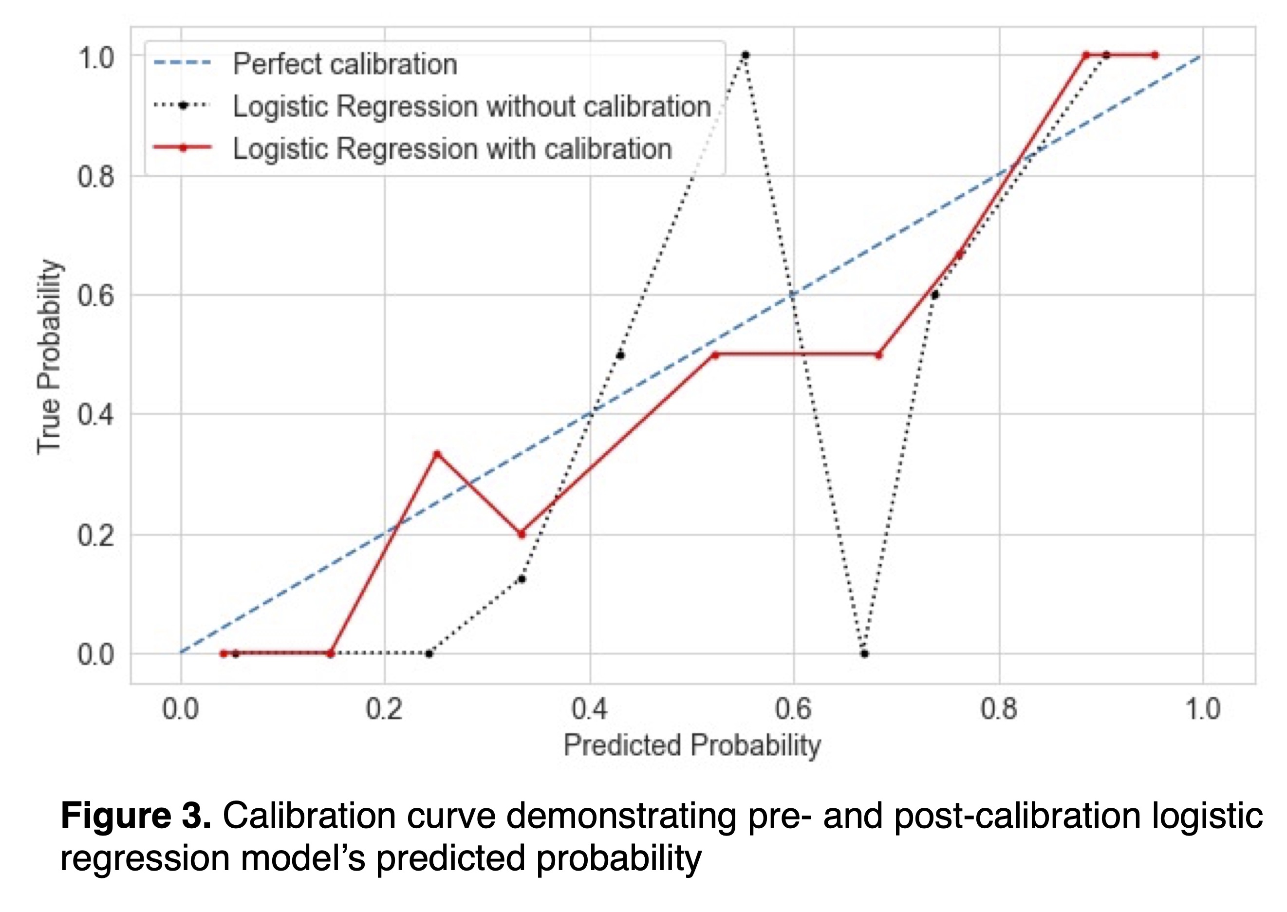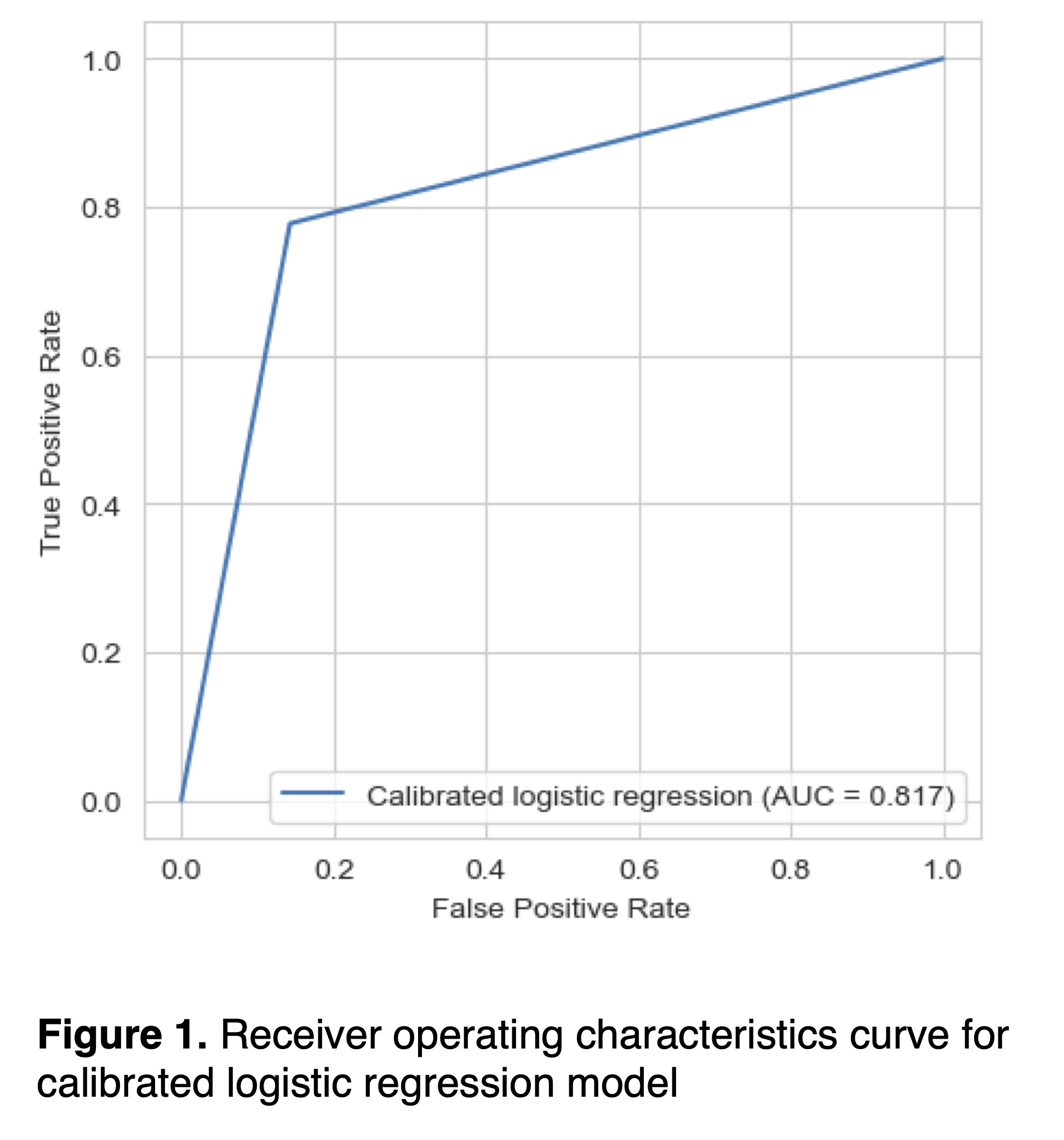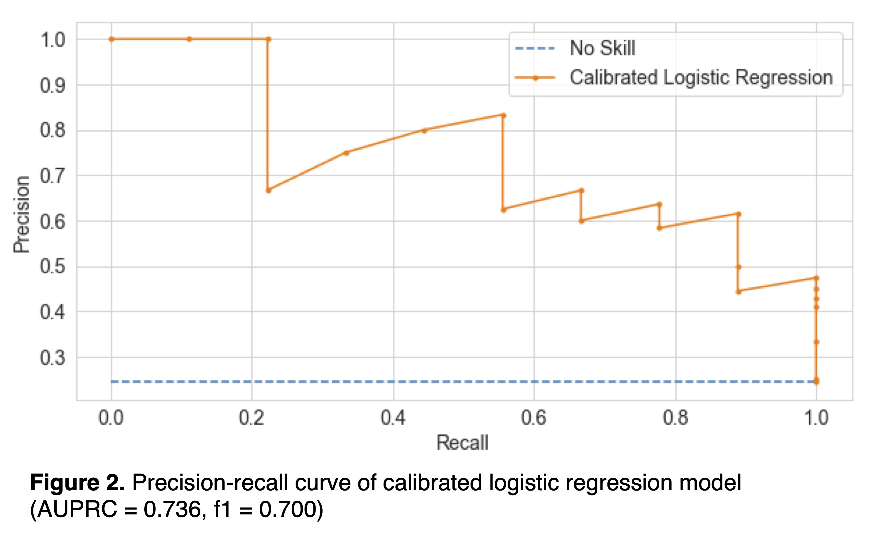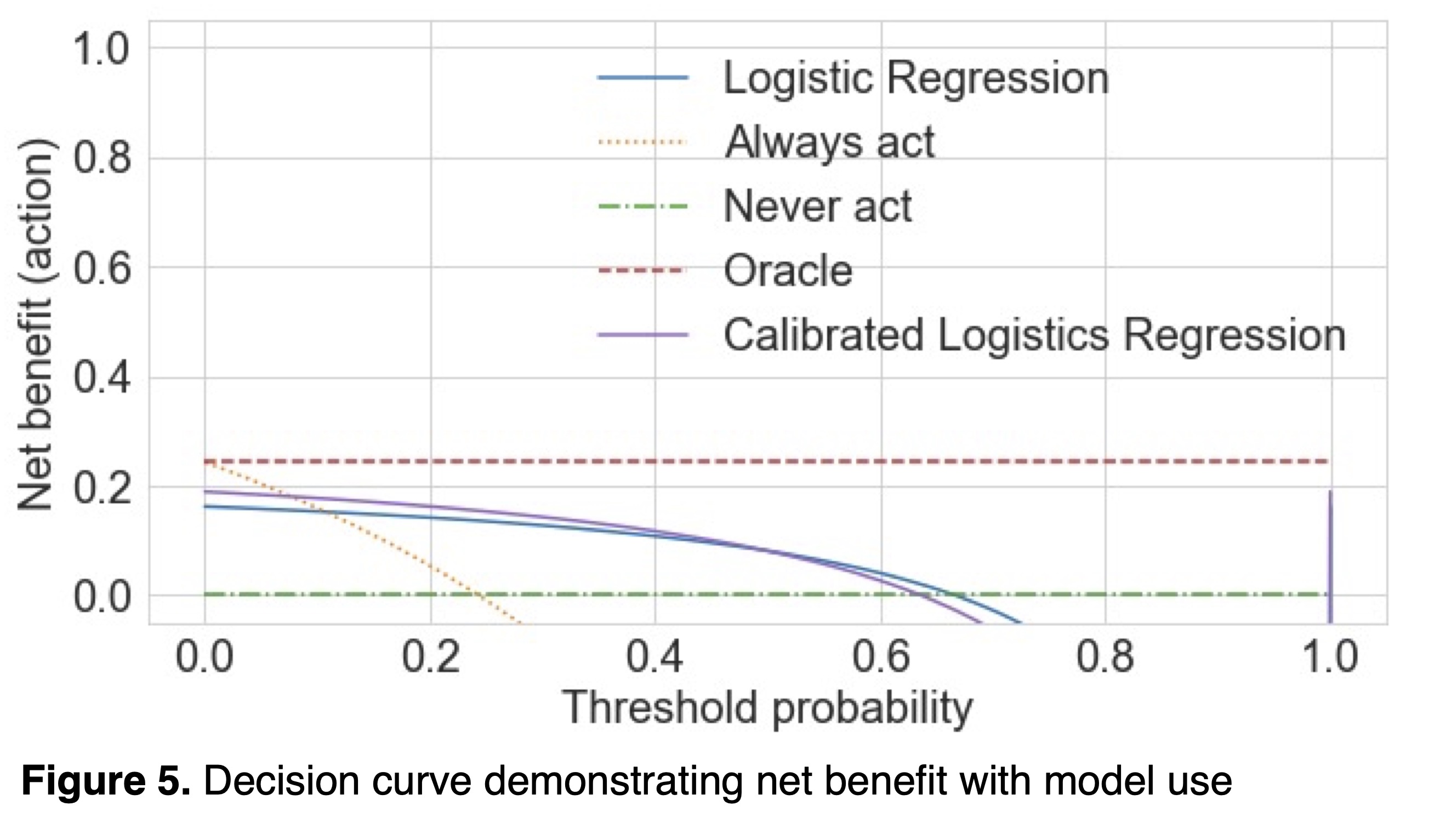 Results: A total of 183 patients were included in the analysis. Sixty-five patients had obstruction identified on MAG-3 scan (35.5%). Variables included in model building were: age, sex, laterality, length, anteroposterior diameter, SFU grade, and maximum ureteral dilation. Following SMOTE-NC, 97 patients with and without obstruction were included in the training group. Using logistic regression with L2 regularization, a model with a three-fold cross validation accuracy of 73.2% was created. The model underwent further calibration and had an area under receiver operating characteristic curve (AUROC) of 0.817 (Figure 1). The area under precision-recall curve (AUPRC) was 0.736 with f1 score of 0.700 (Figure 2). The calibration curve showed accurate prediction of the model (Figure 3) with excellent negative predictive value and specificity of 0.923 and 0.857, respectively (Figure 4). The decision curve demonstrated net benefit with model use for patients at 10-65% chance of obstruction (Figure 5). The developed prediction model is available as an interactive tool at: https://kimjk4-skpomp-app-yz7c3x.streamlit.app.