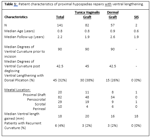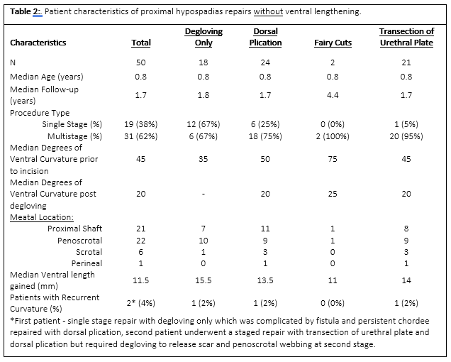 BACKGROUND: Correction of penile curvature in proximal hypospadias repair is critical to achieving a successful, durable, and functional result. Management of ventral curvature remains variable, often dictated by surgeon preference and experience. Options include penile gloving, dorsal plication, transection of urethral plate, and ventral lengthening with and without grafting. We report our comprehensive single institution experience with ventral curvature correction in patients with proximal hypospadias. We hypothesize that overall recurrence of curvature is low regardless of technique chosen, however significant differences in ventral length gained and complication exist between the various techniques. METHODS:We retrospectively reviewed our prospective surgical hypospadias registry for patients who underwent primary proximal hypospadias repair from 2016-2022. We collected information on patient age, meatal location and degree of chordee before and after degloving, preoperative and post-operative measurements of ventral penile length, procedure type, and duration of follow-up We analyzed the incidence of recurrent curvature amongst the various techniques. A descriptive analysis of outcomes was performed stratifying by type of chordee correction. RESULTS:In total, 191 patients underwent primary proximal hypospadias repair, of which 22 were single stage procedures. 141 patients required ventral lengthening with a single corporotomy and grafting including 82 TV grafts, 57 dermal grafts and 2 SIS grafts. 45 (32%) of these patients also required dorsal plication with median follow-up of 2 years (Table 1). 50 (25%) patients did not require a ventral lengthening procedure for curvature correction and had median follow-up was 1.7 years. (Table 2). Median ventral curvature prior to incision and post-degloving was 90 and 42.5 degrees in the ventral lengthening patients versus 45 and 20 degrees in the non-ventral lengthening patients, respectively. Median ventral length gained after corporoplasty with ventral lengthening procedure was 18mm compared to 11.5mm in those that did not undergo ventral lengthening. Incidence of recurrent curvature was 4% overall, 2% for TV graft, 2% DG graft , 0% SIS and 4% for no ventral lengthening. Of the 8 patients requiring repeat curvature correction, 3 were corrected with penile degloving, 3 required re-do grafting and 2 required degloving and dorsal plication. CONCLUSIONS:Overall, we found that ventral curvature is successfully corrected in 96% of patients undergoing primary proximal hypospadias repair. The use of a single ventral corporotomy with grafting in patients with corporal disproportion and severe ventral penile curvature is an effective procedure with a low rate of curvature recurrence. Median ventral length gained with this approach is 18mm. While no differences in complications were found, those that did require a ventral lengthening procedure had an overall greater gain in ventral length. Although we have a high degree of success to date, selecting appropriate techniques to correct ventral penile curvature will require continued follow up into puberty to verify outcomes.